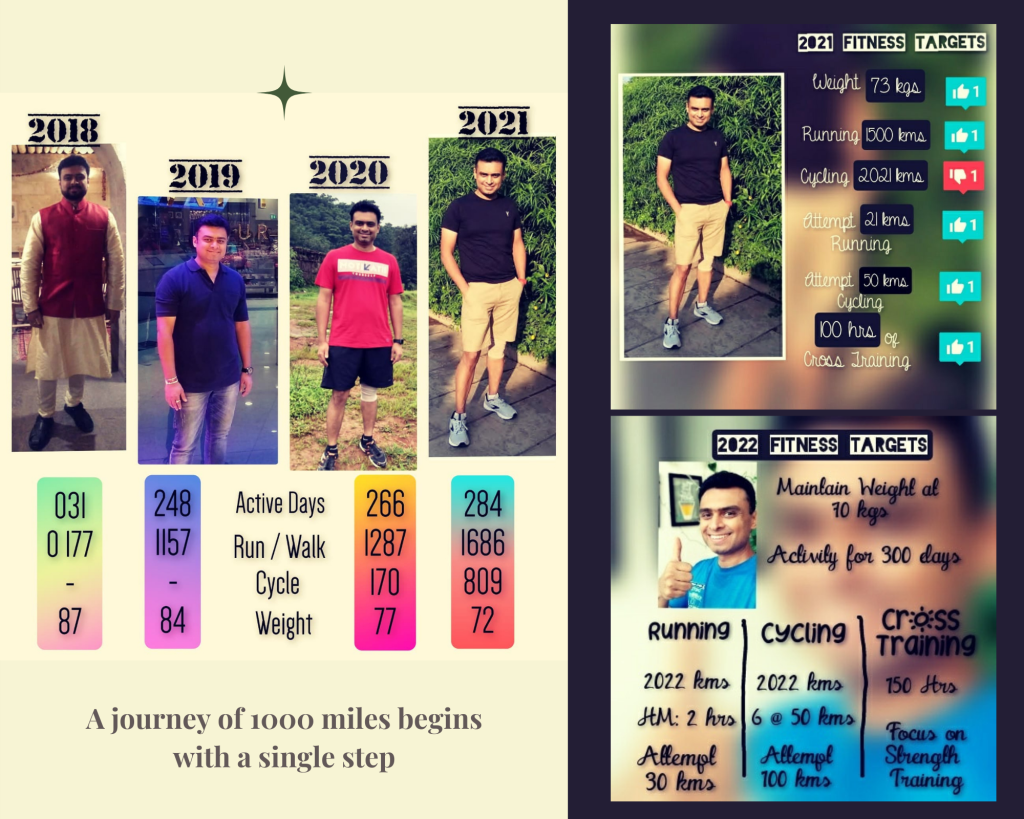 The year 2021, taught me a lot of things about fitness. At the end of the year, I was at 72 kgs from 77 kgs. I was able to beat my own record of running miles. The first year of cycling was also considerably well. In addition to this, I had trained for almost 100 cross training hours. I have realised in the last few years that even if you are able to progress marginally, it is still a progress.